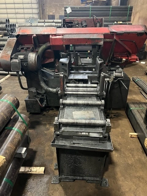 16" x 16". The rigid ‘C’ section frame carries the mountings for the two band wheels, heavy-duty worm drive gear reducer, the band drive motor, and saw guide arm mounting supports.