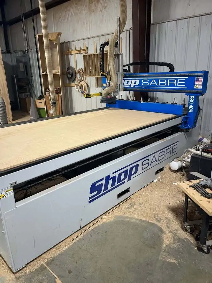 Full ball screw on every axis, A/C digital servo motors, Single phase F4 vacuum system (4 zone), Wireless handheld controller, Shop Sabre computer system, 3KW 4HP HSD 18,000 MAX RPM Spindle with VFD, 5’x8’ working area