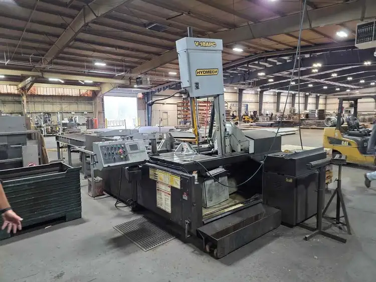 For Sale Low Usage V-18APC is fast, with its high speed shuttle feed indexing up to 40″ in a single movement. A 2 HP driven hydraulic pump supplies system pressure through 3-position directional valves controlling all vising, head swing, head advance/retract, blade tension, guide arm, and shuttle movement.